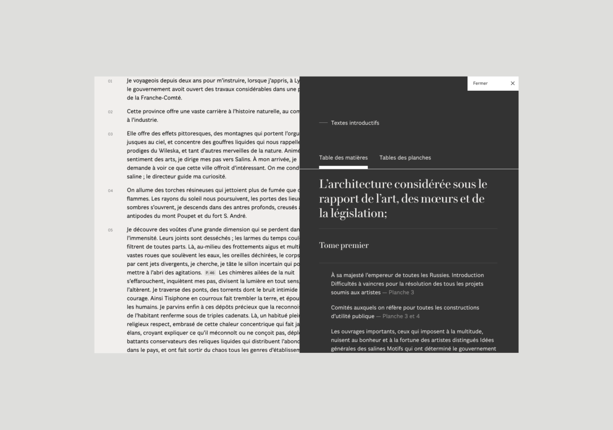 En collaboration avec des chercheurs du Labex "Les passés dans le présent" et rattachés à l'université Paris-Nanterre et à l'Université de Montréal, nous avons assuré le design, la conception ergonomique et fonctionnelle et l'intégration front de l'édition critique de l'ouvrage de référence de l'architecte, urbaniste et utopiste français Claude-Nicolas Ledoux, principalement actif à la fin de l'Ancien Régime.